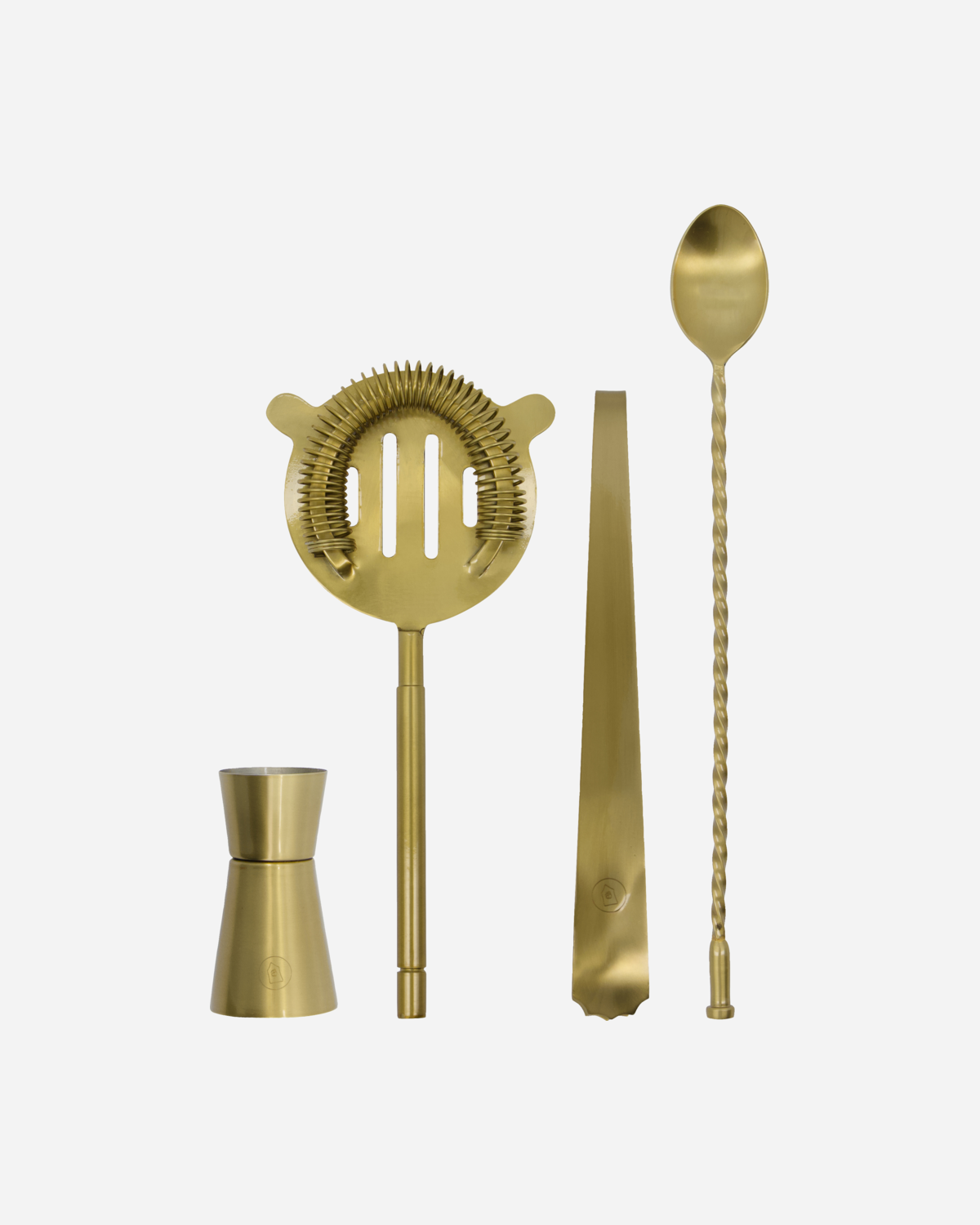 Apportez une touche vintage et élégante à vos apéritifs avec cet ensemble d'accessoires à cocktails au fini laiton vieilli. Format shaker, passoire, cuillère de bar et pince à glace réunissent style et raffinement pour créer vos cocktails comme un professionnel, que ce soit sur votre table de salle à manger ou dans un coin bar. L'acier inoxydable assure une grande qualité et une belle durabilité, donnant une allure sophistiquée à chaque réception.