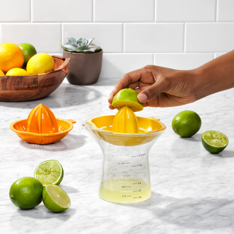 Avec le presse-agrumes OXO, vous pouvez presser citrons et oranges en grande quantité pour tous les besoins en cuisine et en pâtisserie. Il est fourni avec 2 cônes différents : un petit cône jaune pour presser les citrons et les citrons verts, un grand cône orange pour les oranges et pomelos. La forme spéciale de ses cônes de presse a été spécialement conçue pour extraire le maximum de jus du fruit en question. Sa base est un filtre aux maillages très fins qui ne va laisser passer que le jus et retiendra tous les pépins. La partie supérieure avec le cône est tenue solidement au contenant pour une excellente stabilité et un geste sûr. Le récipient d’une contenance de 350 ml offre une lecture facilitée grâce à ses graduations. Grâce à son bec verseur, vous transvaserez facilement le jus collecté, sans en perdre une goutte ! Les 3 éléments sont démontables pour le nettoyage, puis s’emboitent pour un rangement compact.